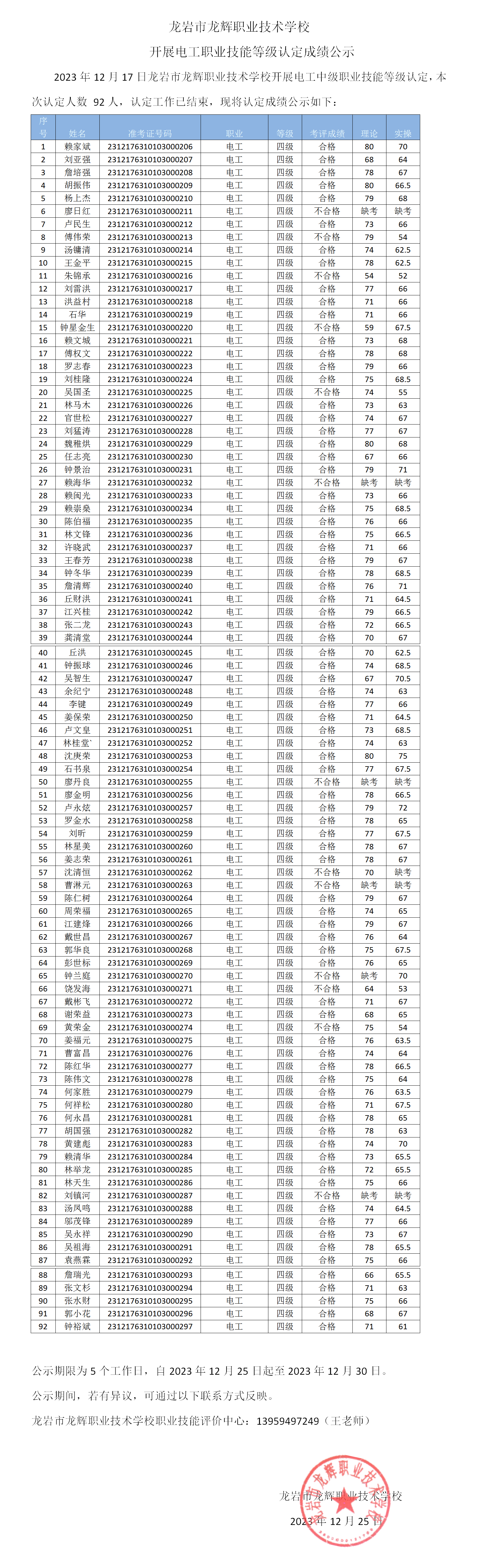 龍巖市龍輝職業(yè)技術(shù)學(xué)校關(guān)于2023年12月17日電工中級(jí)技能等級(jí)認(rèn)定成績(jī)公示
