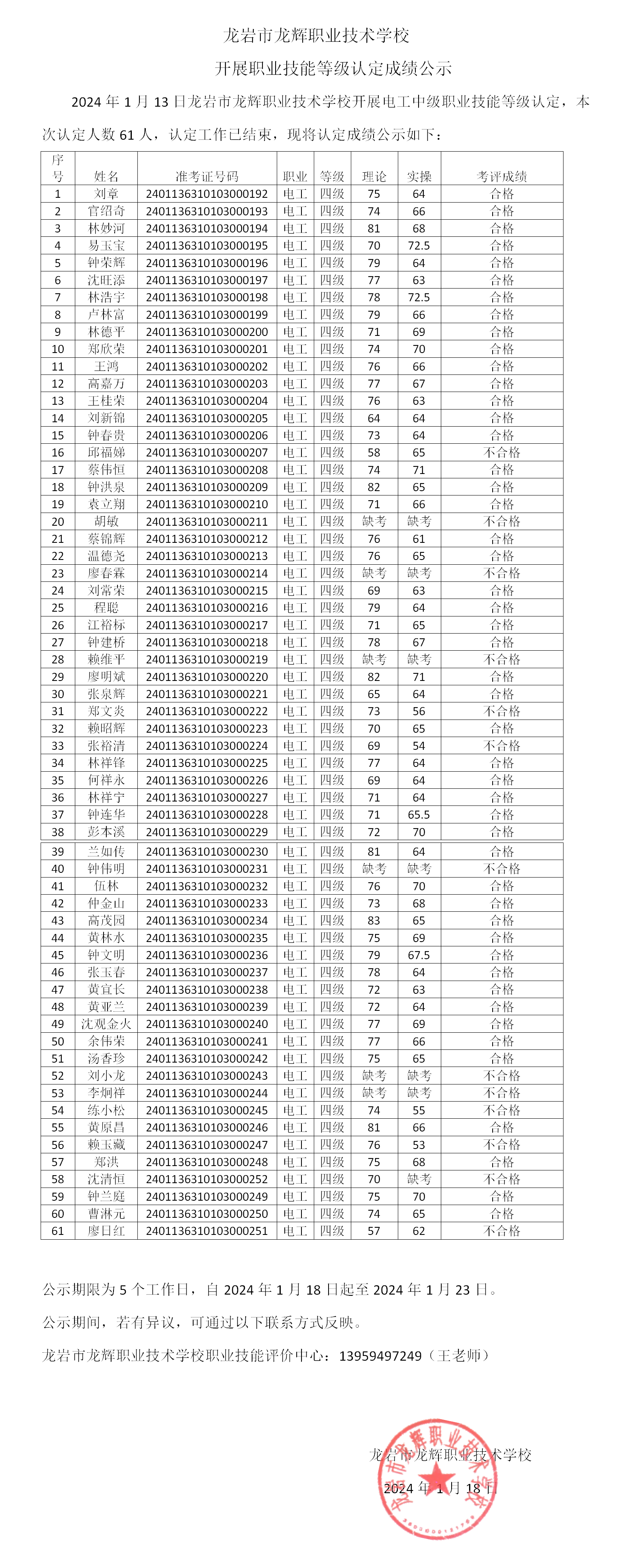 龍巖市龍輝職業(yè)技術(shù)學(xué)校關(guān)于2024年1月13日電工中級技能等級認(rèn)定成績公示