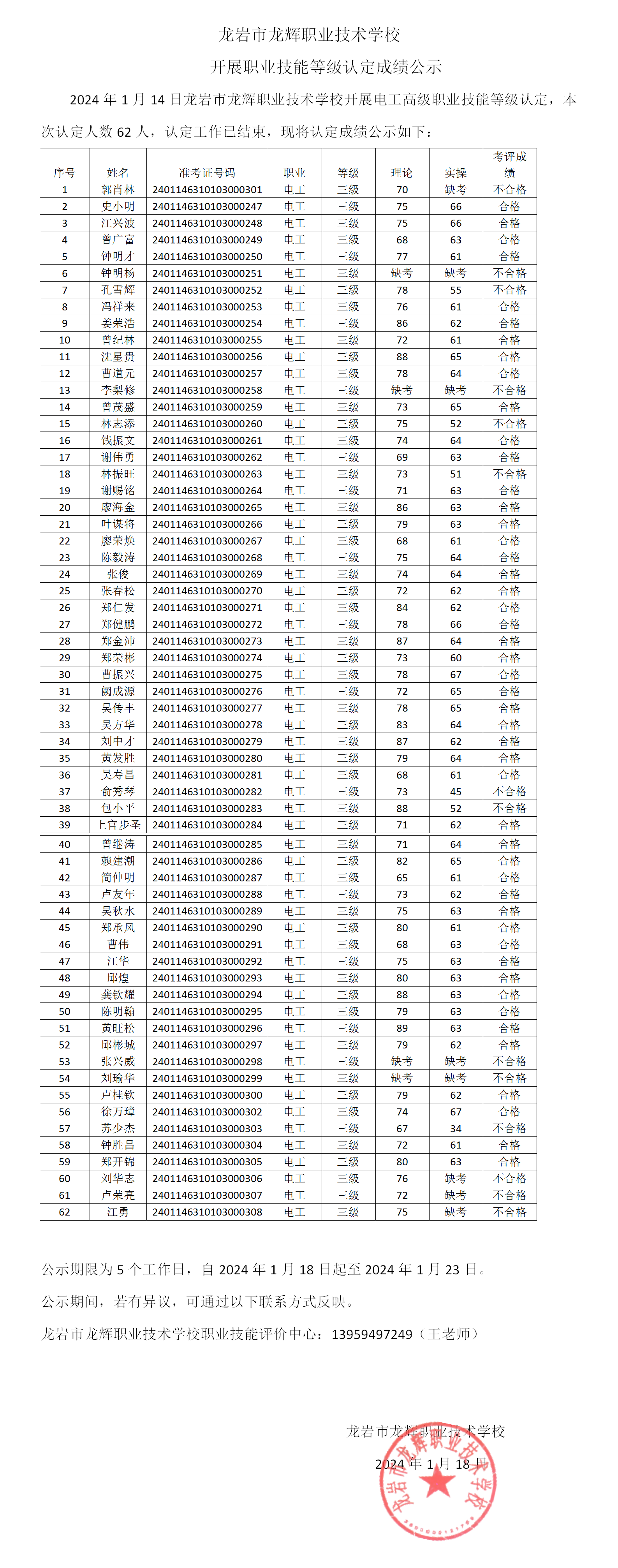 龍巖市龍輝職業(yè)技術(shù)學(xué)校關(guān)于2024年1月14日電工高級技能等級認(rèn)定成績公示