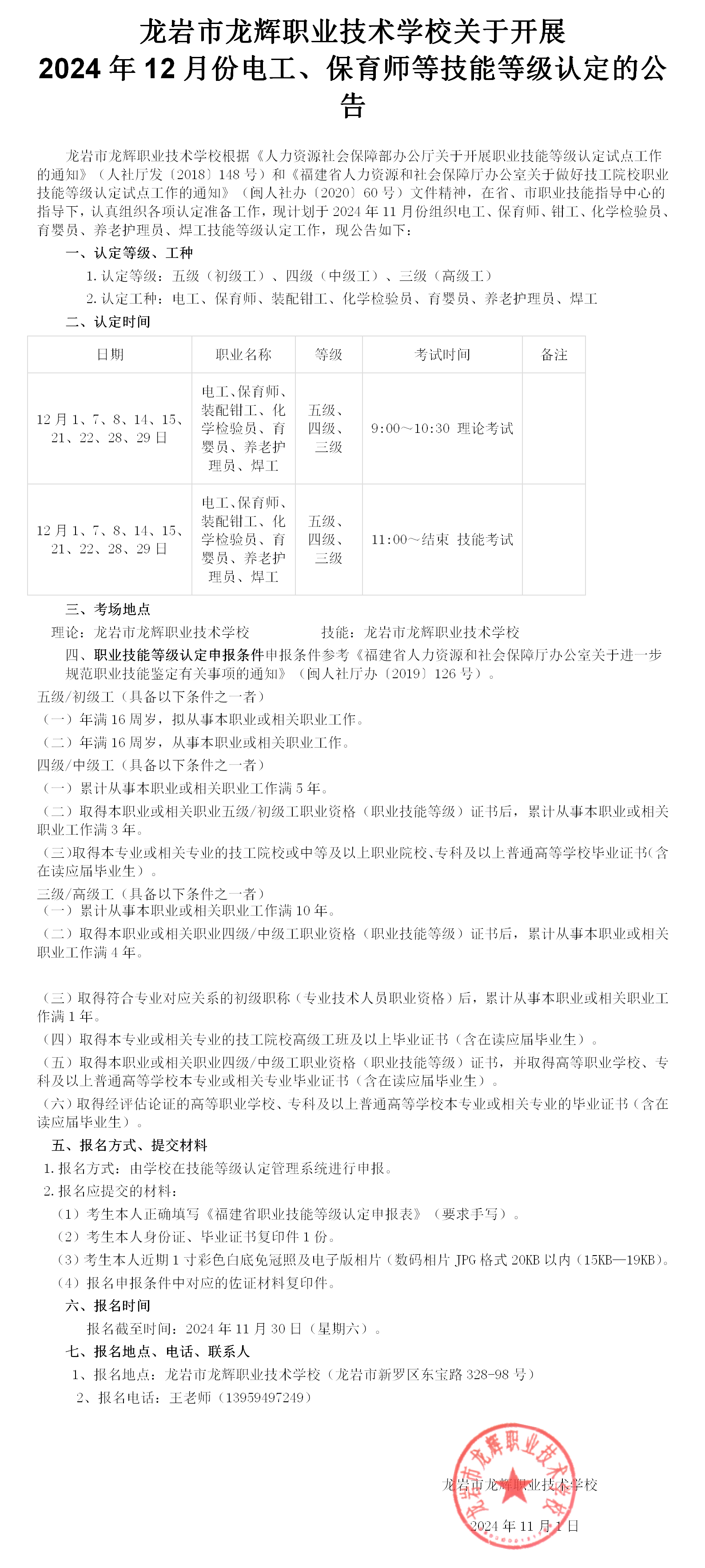 2024年12月份電工、鉗工、保育師、化學檢驗員公示