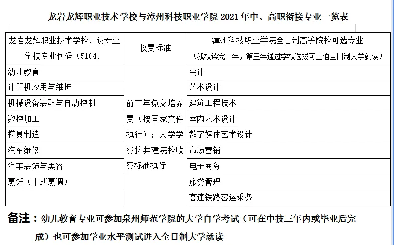 龍巖龍輝職業(yè)技術(shù)學(xué)校專業(yè)一覽表(代碼:5104)